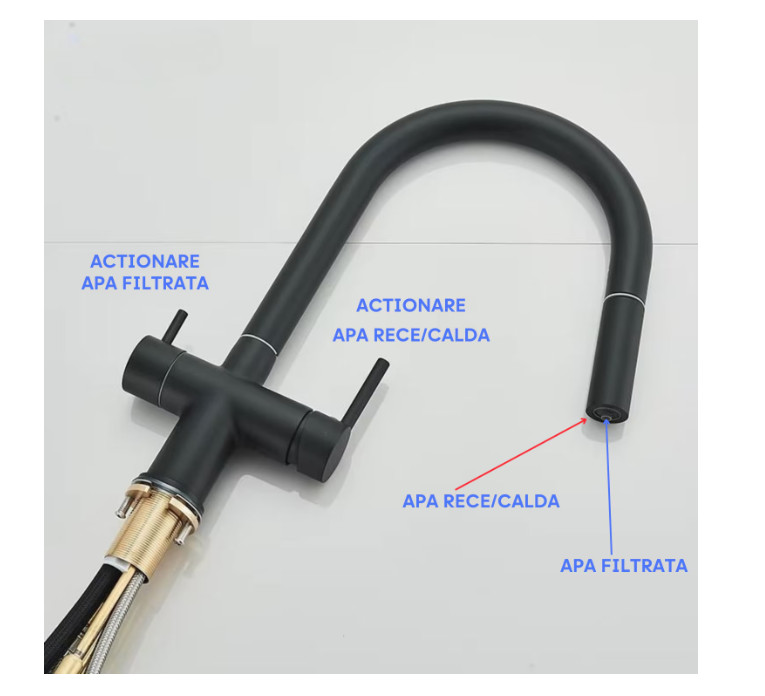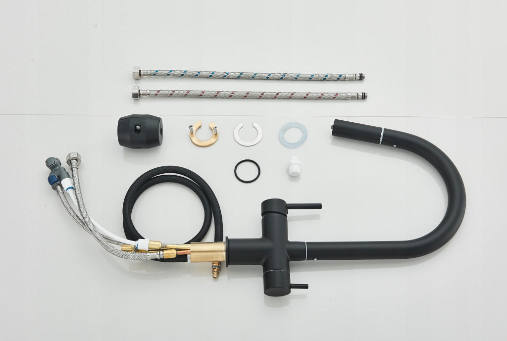 - Konyhai csaptelep, 2 vízáramlási funkcióval háztartási használatra (meleg és hideg) és tisztított víz kimenettel