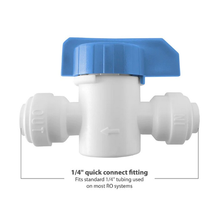 Műanyag elzárócsap (egyenes) CV1344-Q - fordított ozmózis rendszerek vízellátásának nyitására és zárására szolgál. A szelep csatlakozásainak mérete 2 x 1/4"-os, Quick típusú (gyors kioldású), 6 mm-es (1/4 hüvelykes) csövekhez.